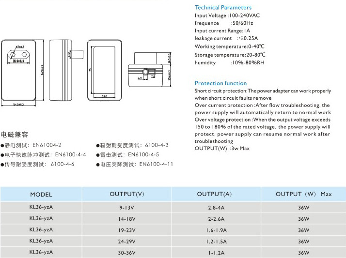 頻率:50/60Hz 輸入電流:1A 漏電電流:≤0.25A 工作溫度:0-40℃ 貯藏溫度:-20-80℃ 濕度:10%-80%RH 短路保護(hù): 電源適配器在短路解除時能正常工作恢復(fù) 過流保護(hù):過流故障排除后,電源將自動恢復(fù)正常工作 過壓保護(hù):當(dāng)輸出電壓超過額定電壓的150-180%時,電源將保護(hù),故障排除后電源能恢復(fù)正常工作" />